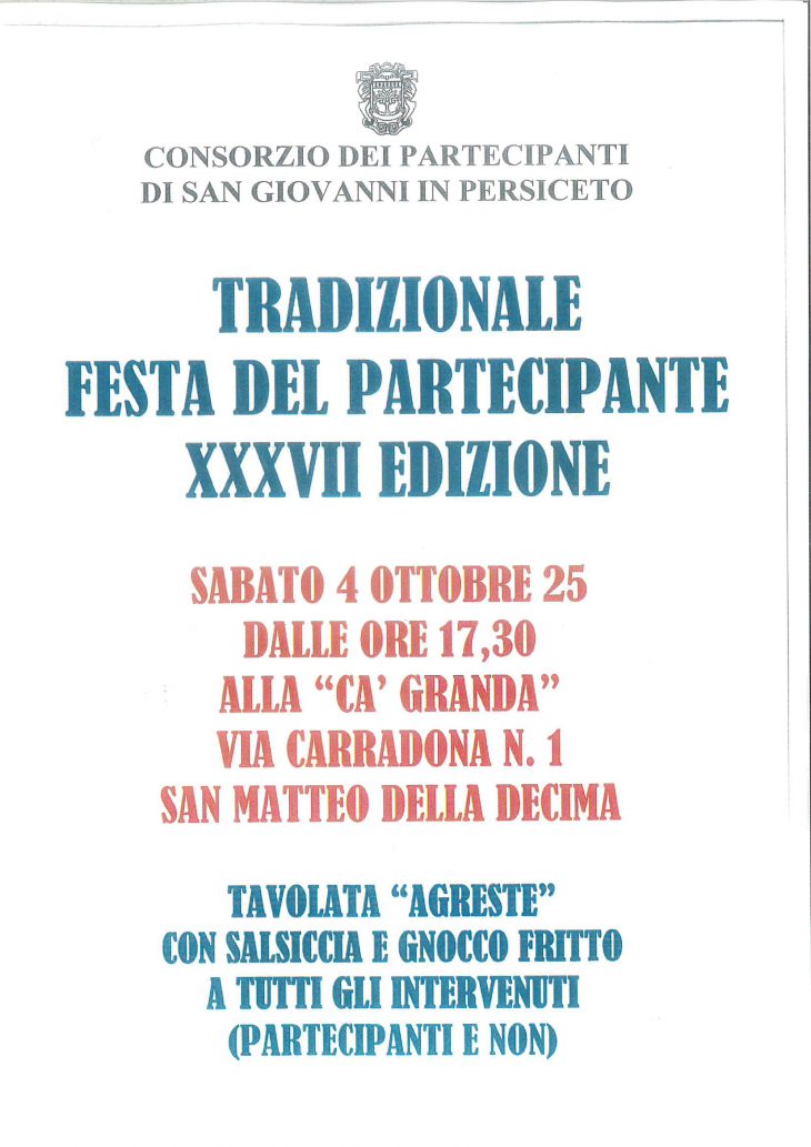 XXXVII Festa del Partecipante Eventi Sabato 4 Ottobre 2025 dalle ore 17,30 in poi presso la Cà Grande via Carradona 1 San Matteo della Decima tavolata “agreste” con salsiccia e gnocco fritto a tutti gli intervenuti Correlati